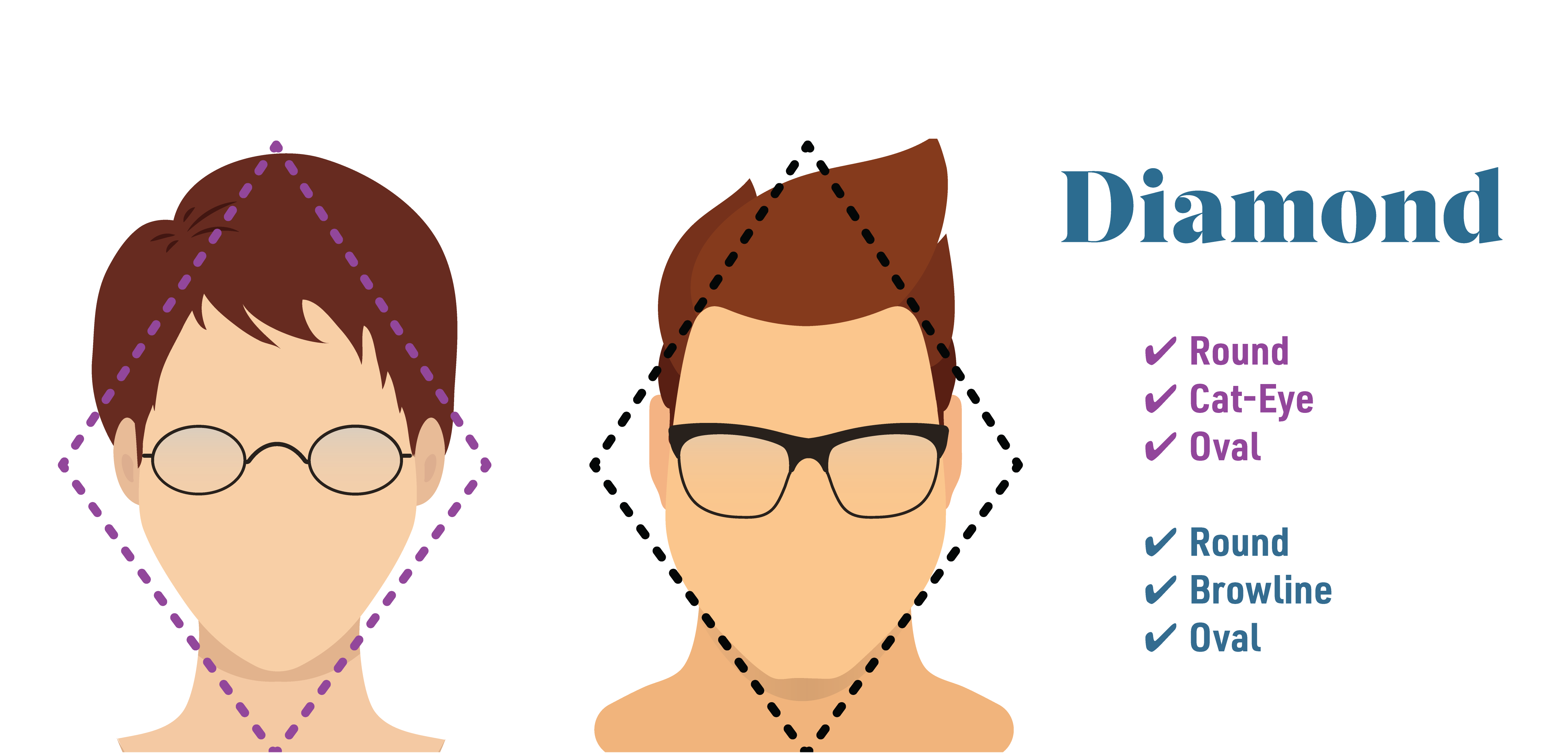 A diamond face combines an angular jawline and prominent cheekbones with a narrower forehead. Men might opt for round or browline frames to balance facial features. For women, round and oval frames add softness to angular features, while cat-eye frames can add volume around narrow cheekbones.
